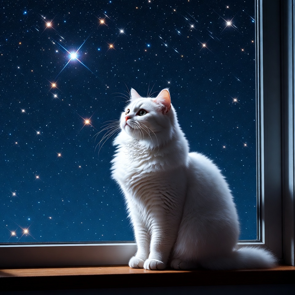A white cat sits on a window sill looking at a starry night sky. The stars shine bright against the dark background.