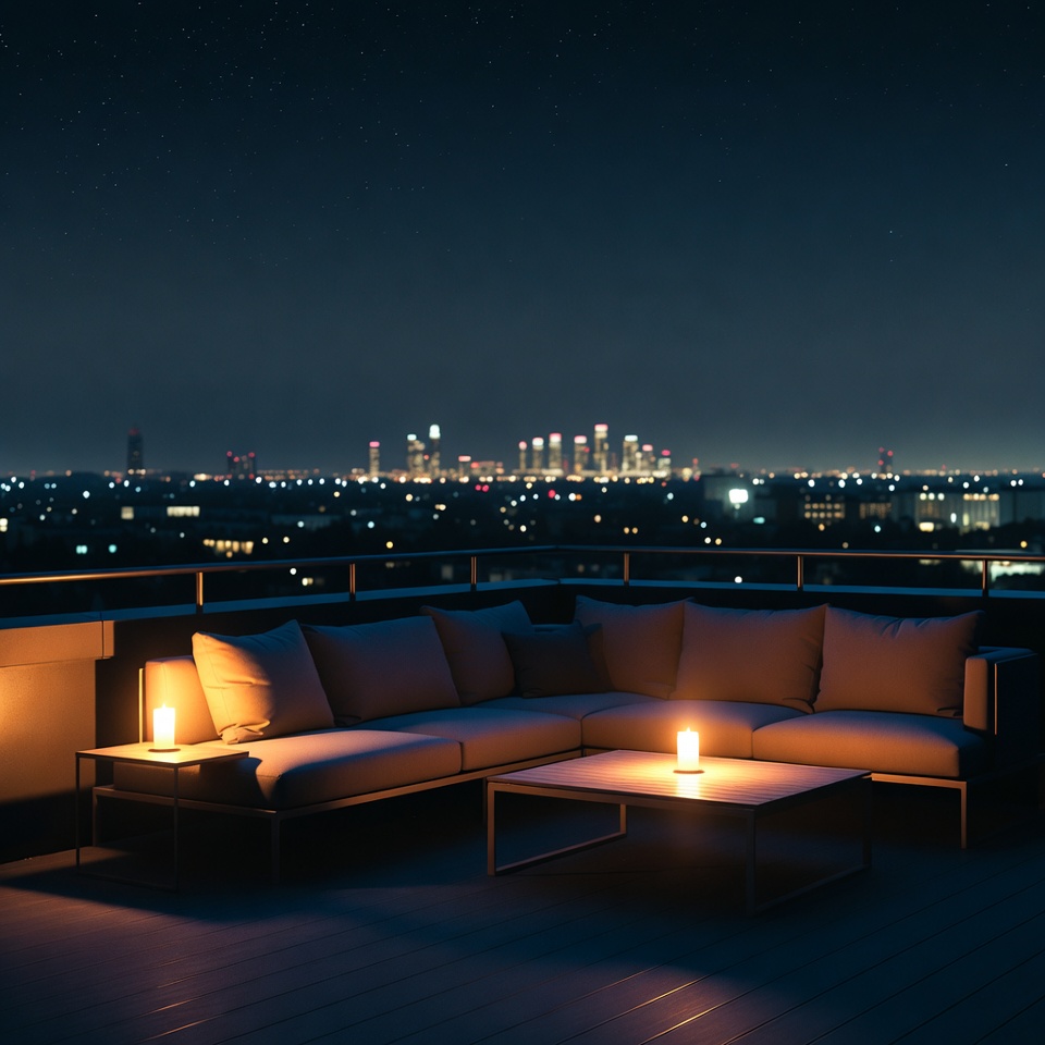 People relax on a rooftop with seating and candles. The city skyline glows in the distance under a starry sky.