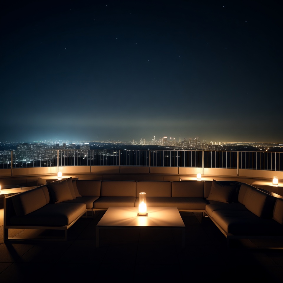 architecture, calmness, city, cityscape, evening, furniture, horizon, landscape, lanterns, lights, lounge, night, outdoor, relaxation, rooftop, seating, skyline, sofas, urban, view