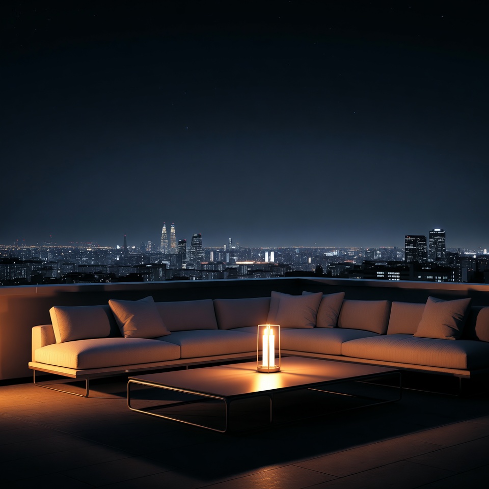 A rooftop lounge features a sofa and a lamp, with a city skyline visible in the background at night. The lights of the buildings shine brightly.