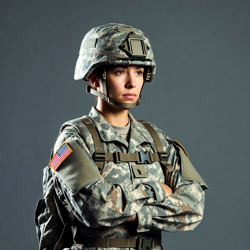 A soldier in military uniform poses with arms crossed, displaying commitment and strength in a neutral setting.