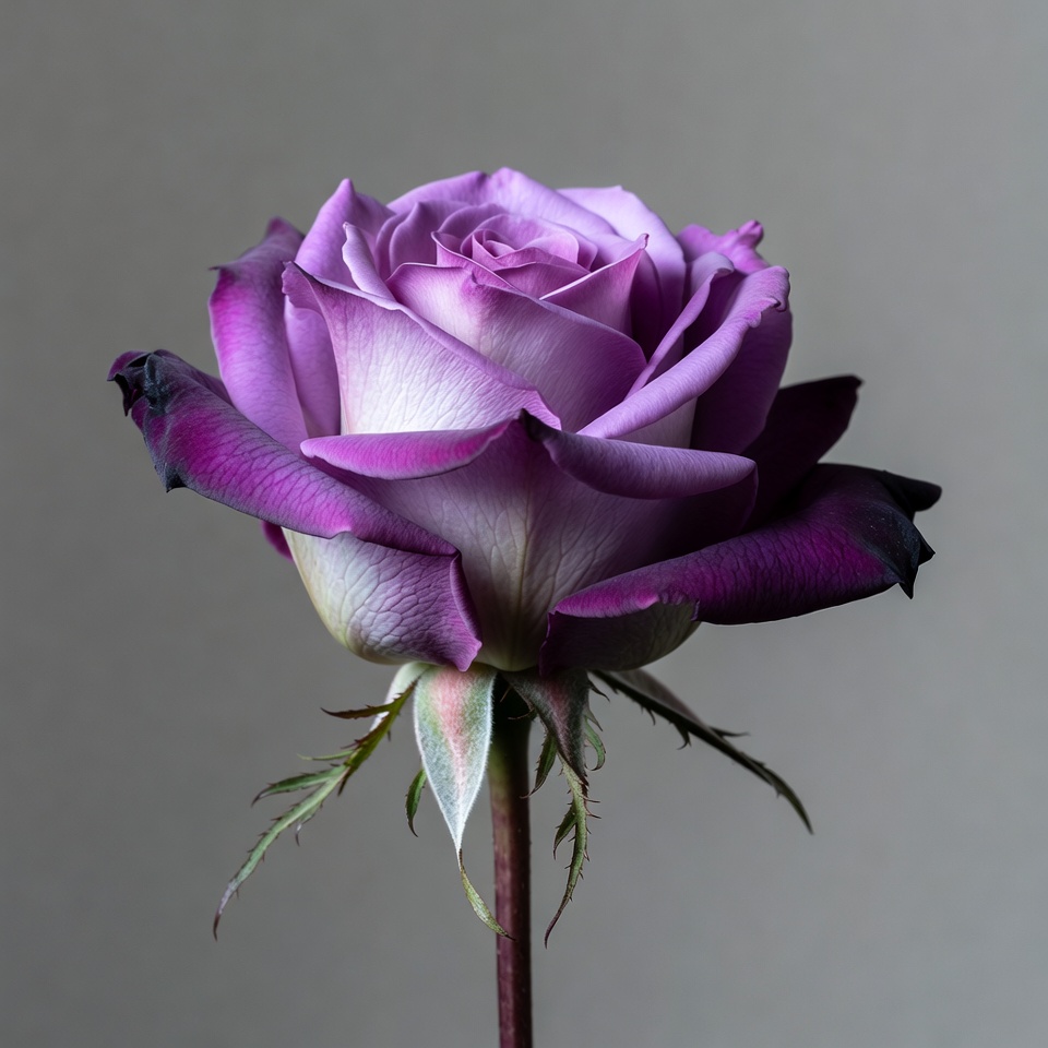 A single purple rose stands upright. The flower shows dark edges and soft petals. A simple background highlights its beauty.