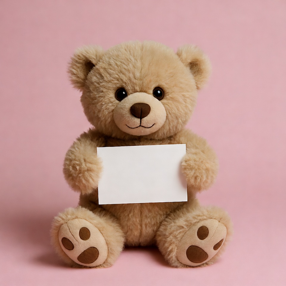 A teddy bear sits on a pink background, holding a blank card in its paws. The bear has a friendly face and soft fur.