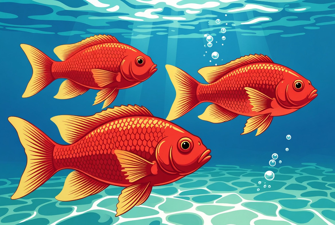 Three red fish move through clear water with bubbles rising. Light shines down from above, creating an underwater scene.