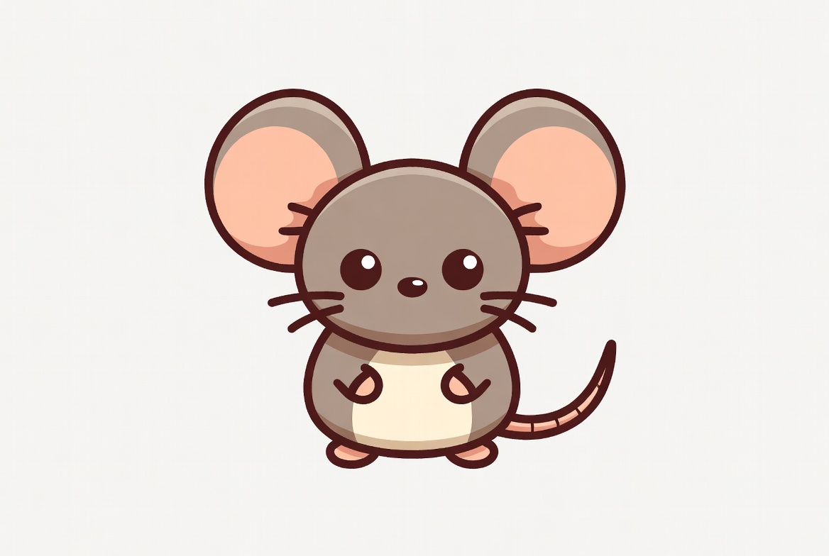 A small cartoon mouse stands with a round face and big ears. The character has a light belly and a long tail, appearing friendly and playful.