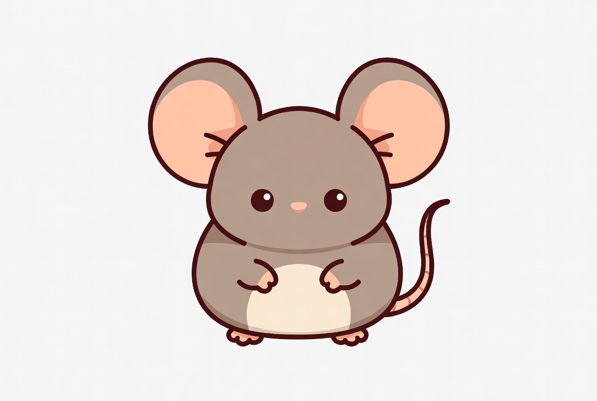 A cartoon mouse stands with its paws together. It has large ears and a rounded body. The background is plain and light.