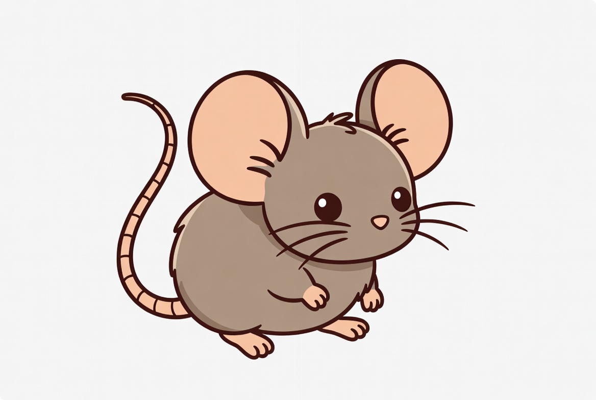 A small cartoon mouse sits on a plain background with its big ears and round body. The mouse appears playful and curious in its stance.