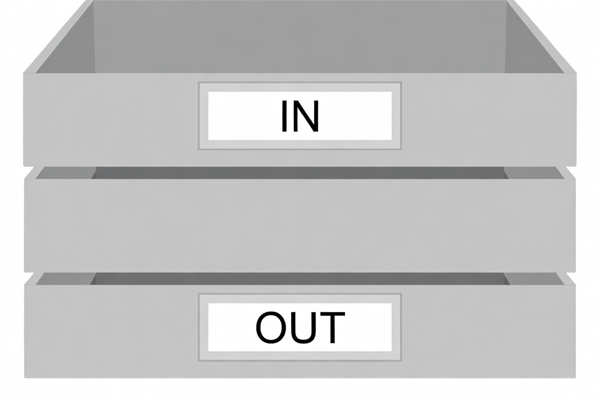 Drawers labeled IN and OUT demonstrate a simple file sorting system. This setup helps organize documents for efficient office work.