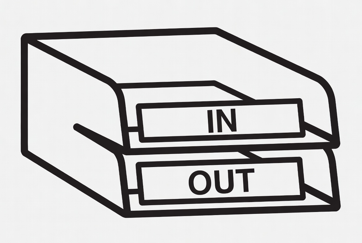 A simple office desk organizer features labeled sections for incoming and outgoing documents. It keeps papers sorted for easy access.