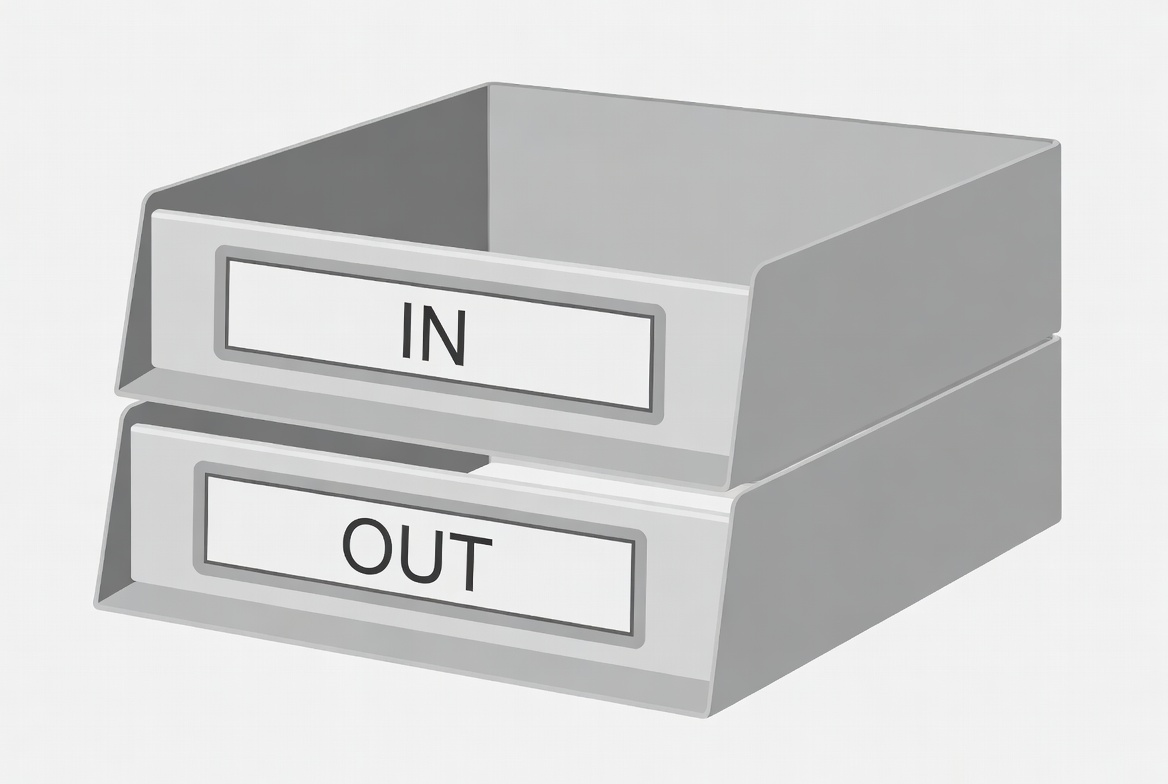 An office drawer has two sections labeled In and Out for sorting documents and files. This helps with task management in a workspace.