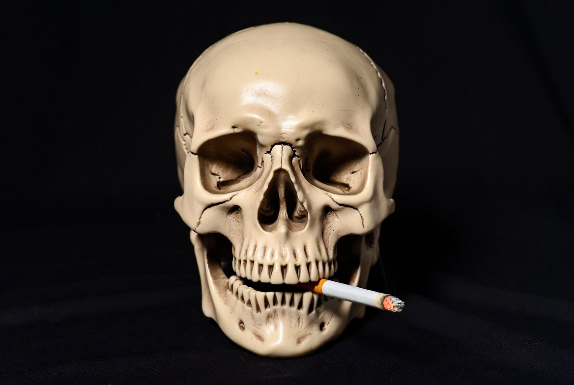 A human skull model sits against a black background with a cigarette held between its teeth. The setting is dark and simple.