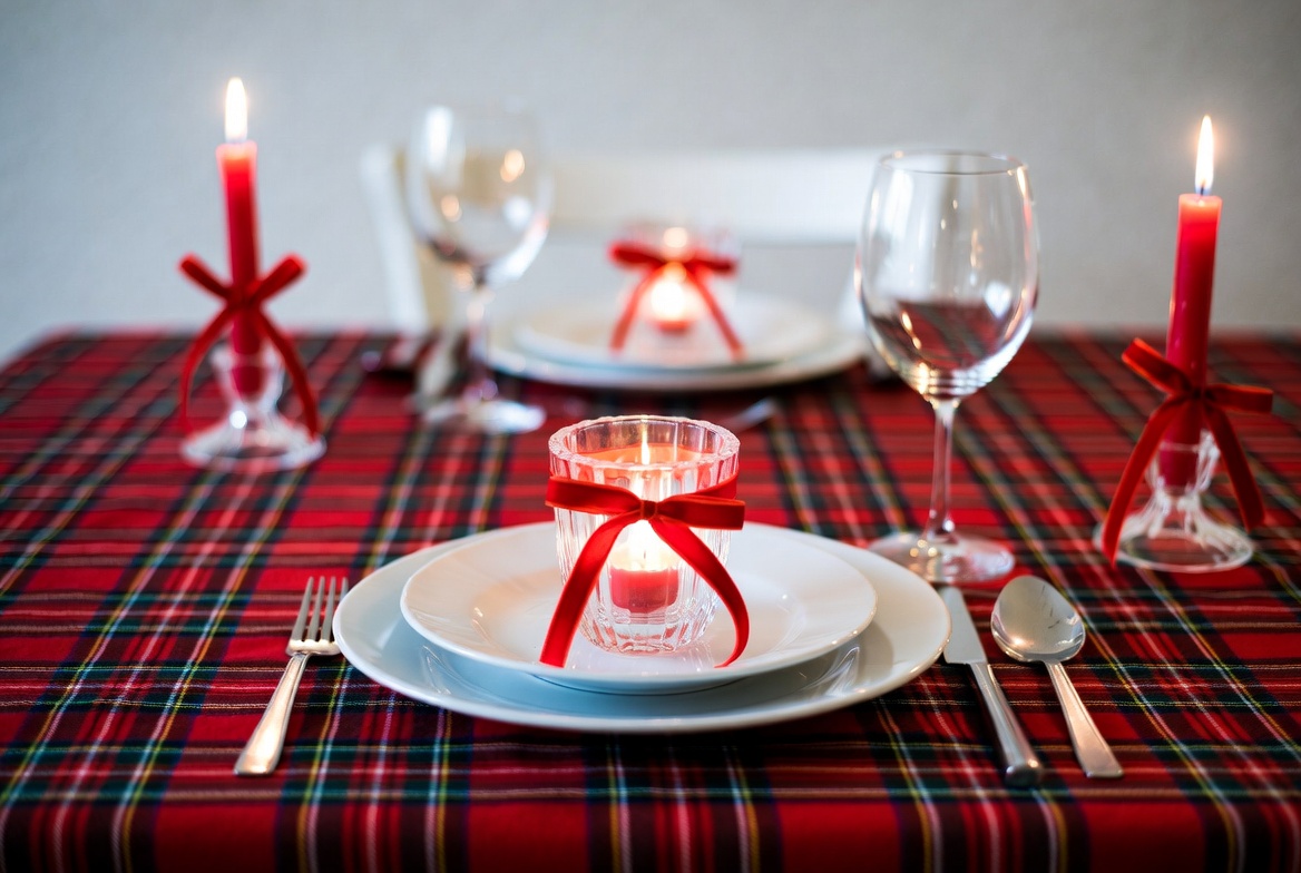 arrangement, candles, celebration, checkered, decor, dining, dinner, evening, festive, gathering, glasses, holiday, lights, meal, plates, red, ribbons, setting, table, utensils