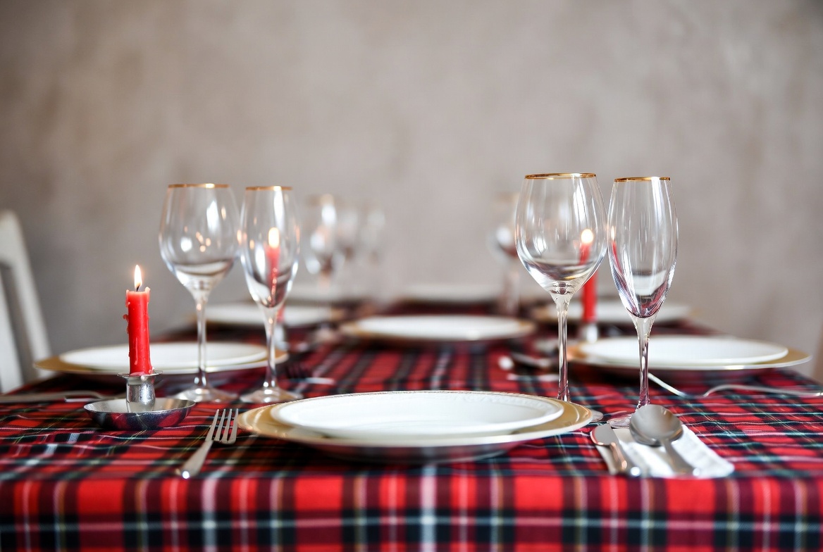 Table is set with plates, glasses, cutlery, and a candle. The tablecloth is checkered red and black, ready for a meal.