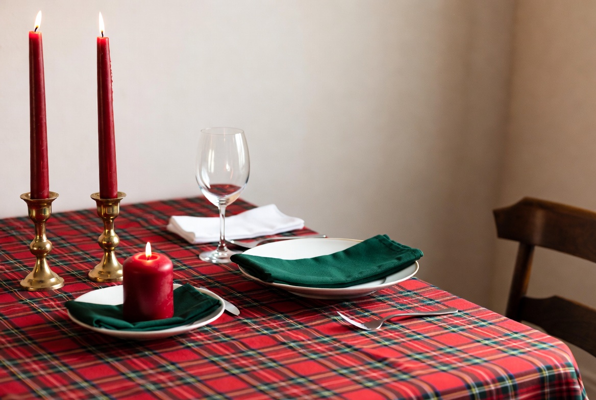 candles, celebration, decor, dinner, feast, festive, gathering, glass, green, holiday, hospitality, inviting, meal, napkins, place, plaid, red, setting, table, utensils