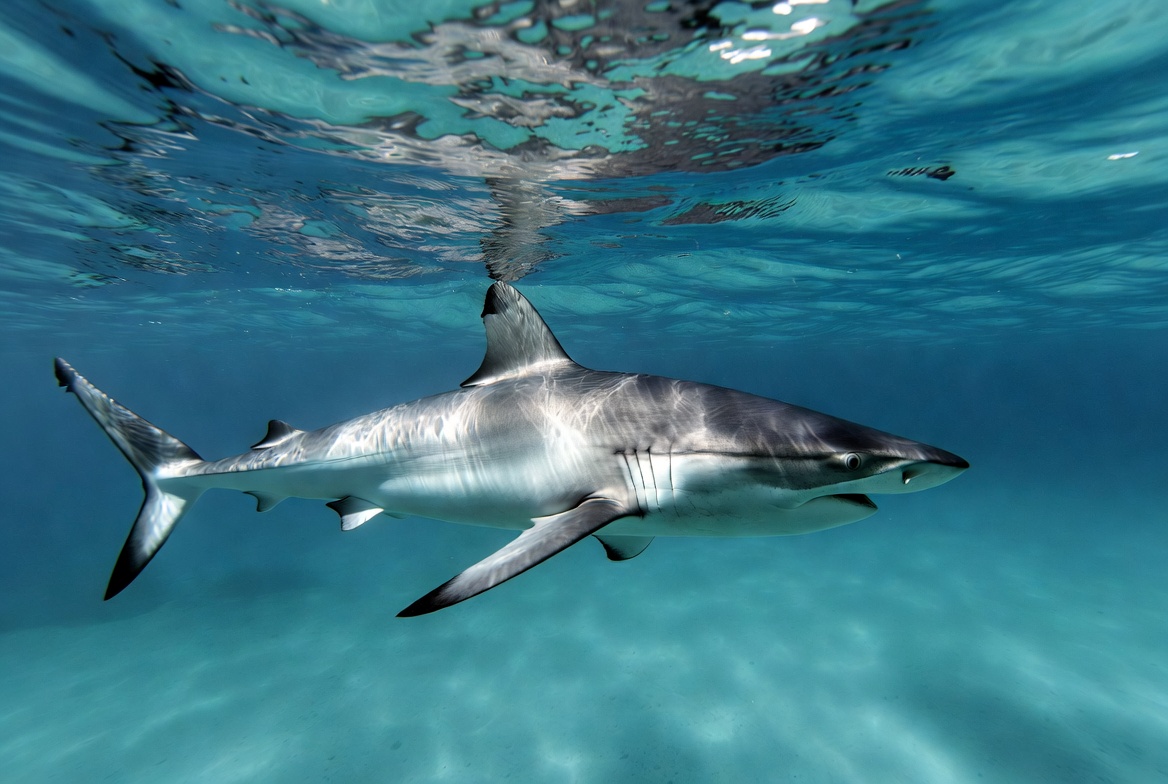 blue, clarity, environment, fins, fish, habitat, marine, nature, ocean, ocean ecosystem, predator, sea, shark, sunbeam, swimming, swimming motion, tail, underwater, water, wildlife