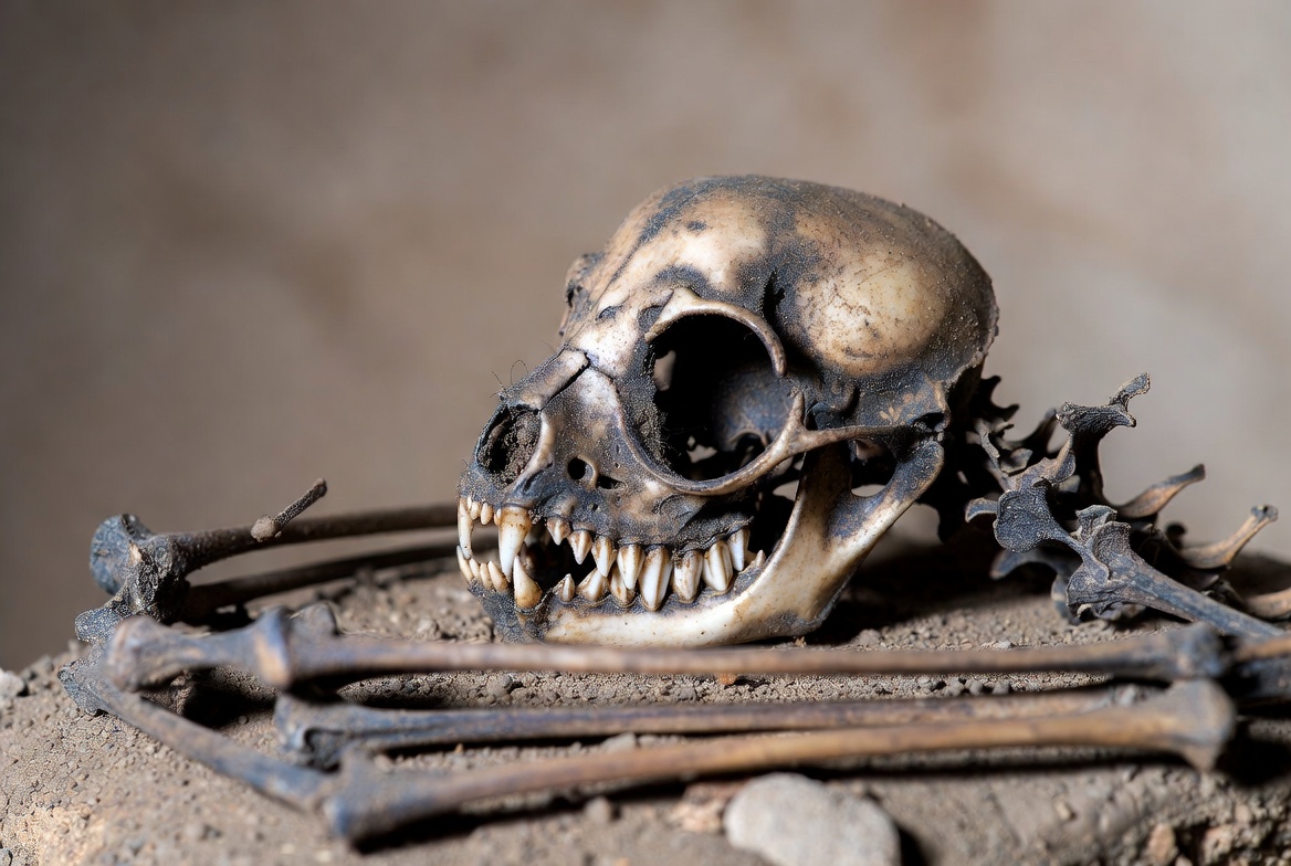 anatomy, archaeology, artifacts, background, bones, discovery, display, dust, education, environment, excavation, lighting, macabre, old, remains, science, skeleton, skull, study, table