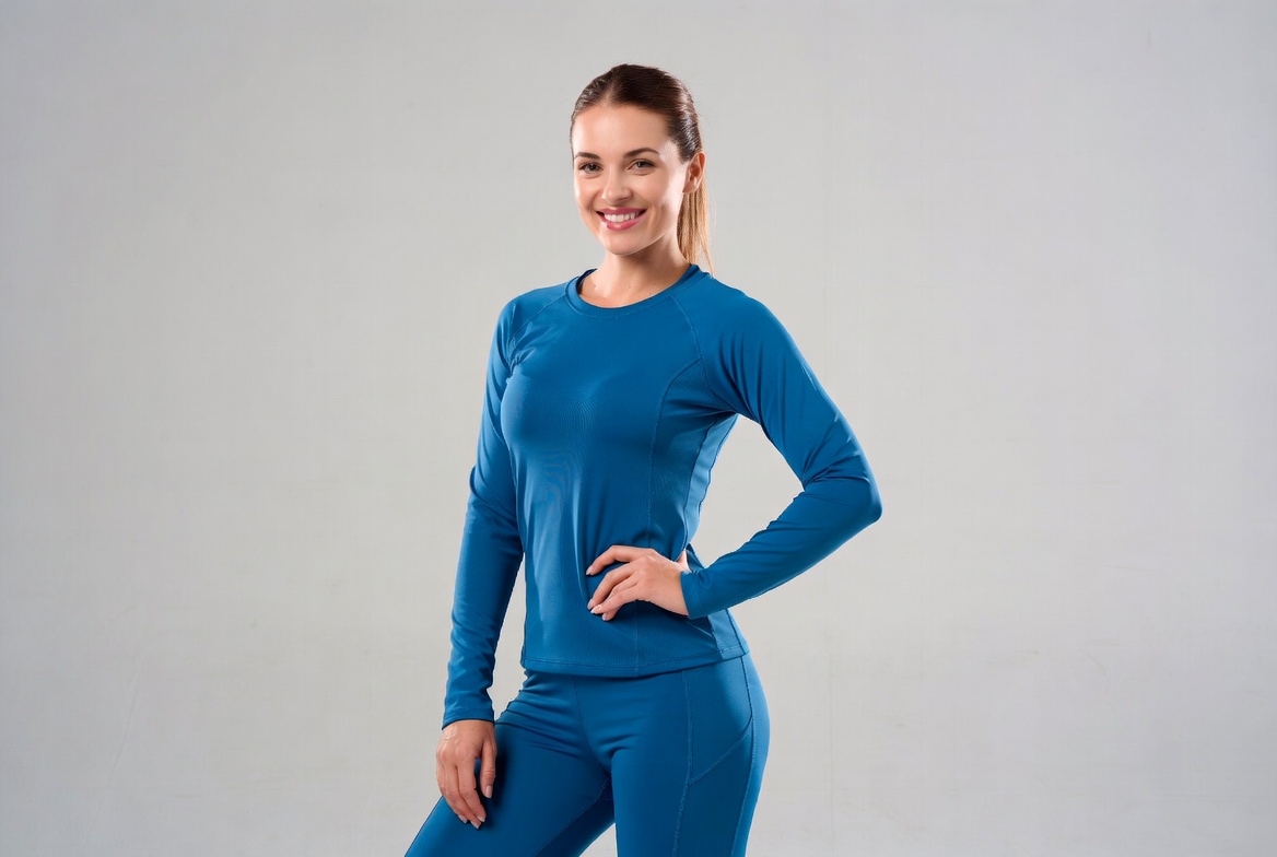 A woman stands and smiles while wearing blue sportswear. She poses confidently against a plain background.