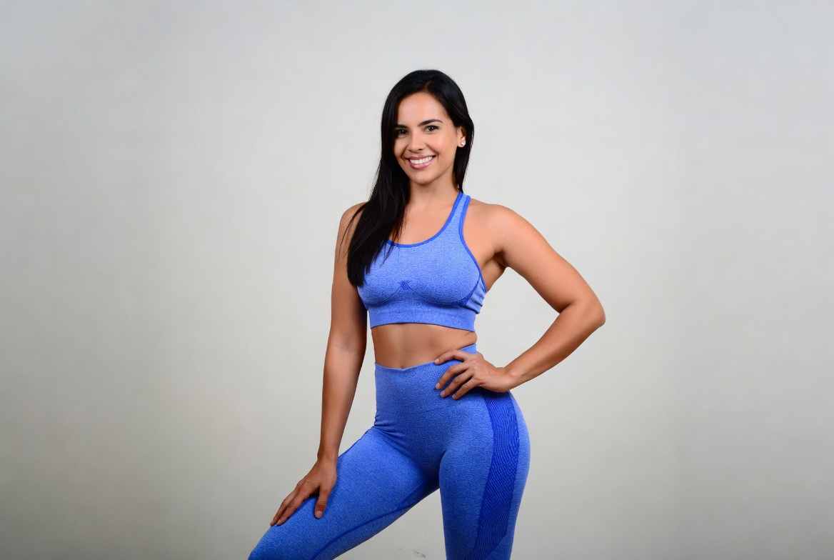 A woman stands smiling in a blue workout outfit. She has long hair and is posing with one hand on her hip, ready for a fitness session.