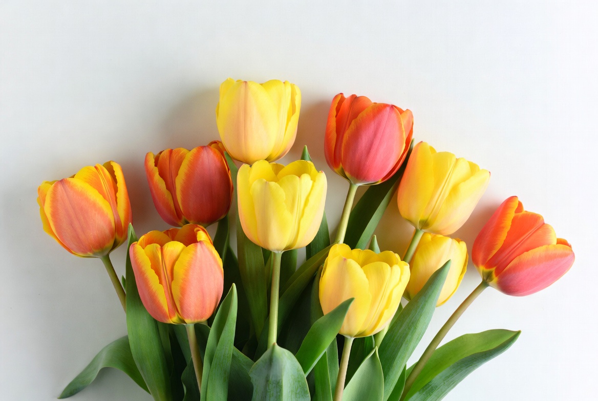 Bright tulips in yellow and red are arranged together on a white table. Some tulips have green leaves attached.