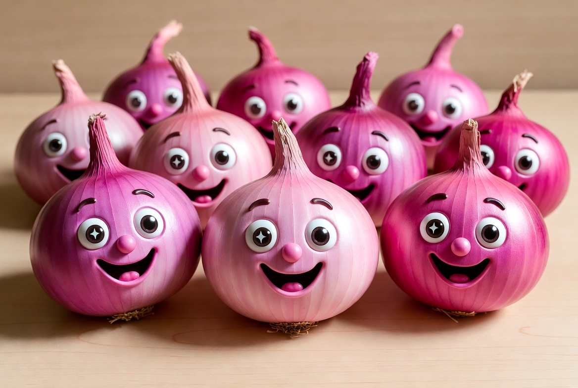 A group of smiling onions with cartoon faces is arranged on a wooden surface. The onions have purple skins and joyful expressions.