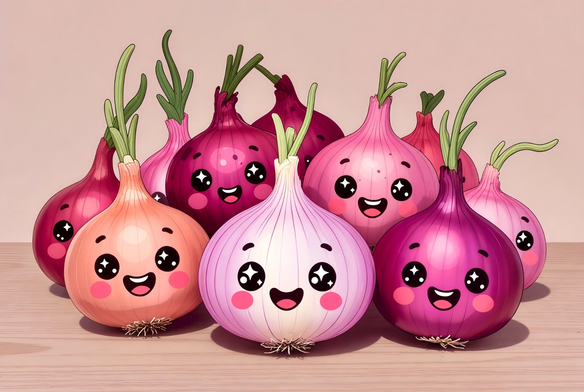 Several colorful onions with happy faces are gathered. They have green tops and pink, purple, and white skins. The setting is simple and light.
