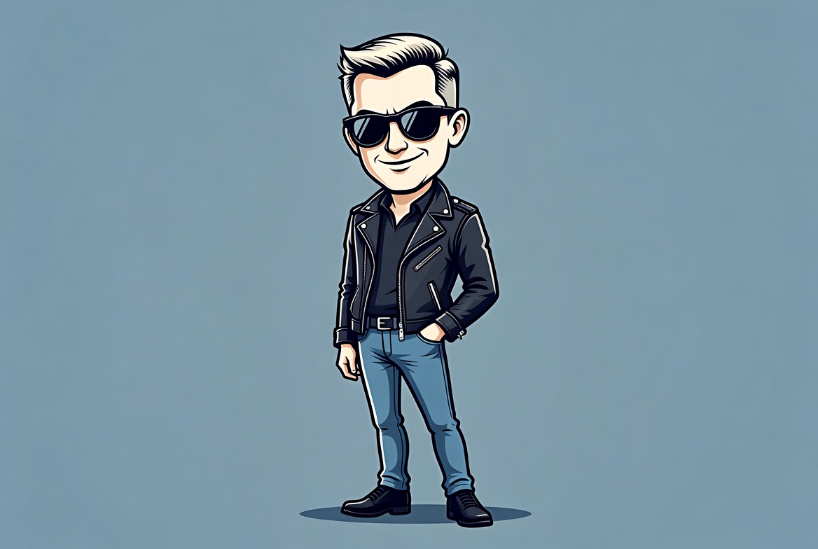 A character stands confidently wearing a black leather jacket and sunglasses. The background is simple and the focus is on the character’s style.