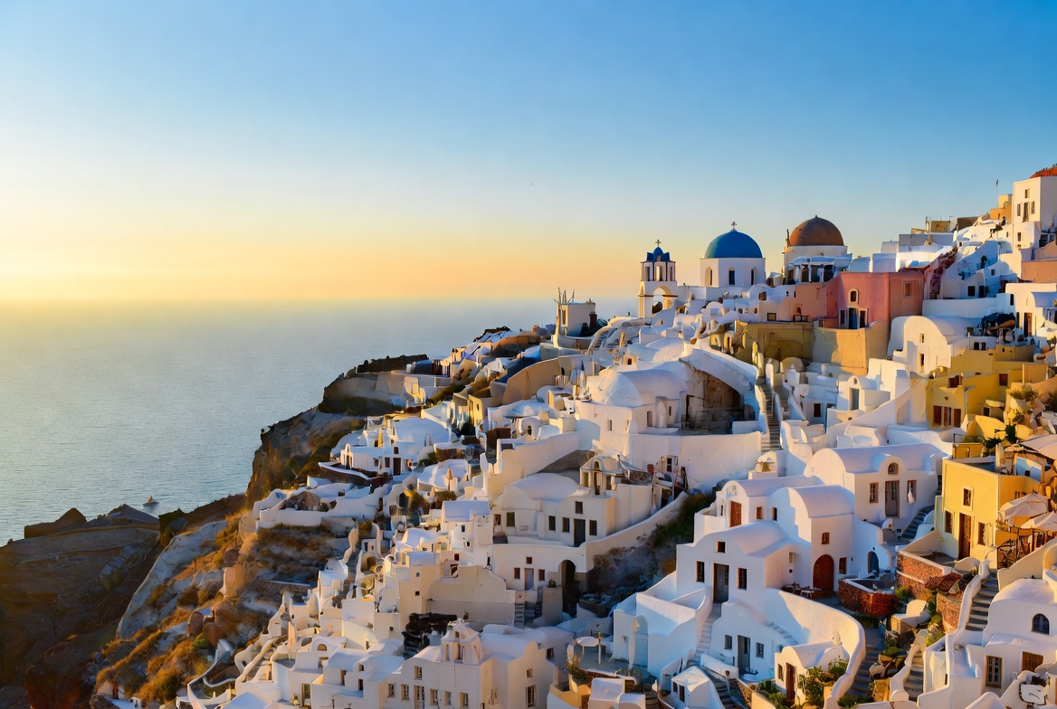 architecture, buildings, coastline, culture, destinations, evening light, greek island, hillside, homes, landscape, natural scenery, ocean, peaceful view, santorini, sea, summer, sunset, tourism, travel, warm colors