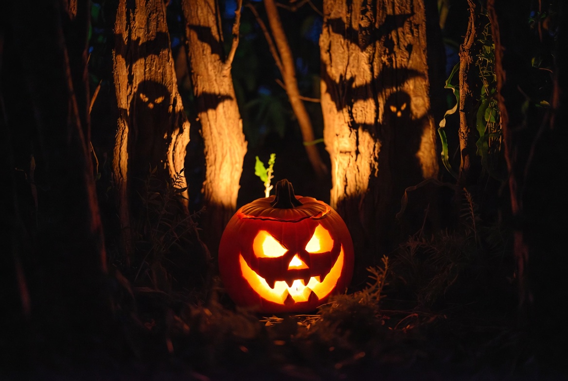 A carved pumpkin shines in the dark forest. Shadows creep on the trees, creating a spooky atmosphere for Halloween night.