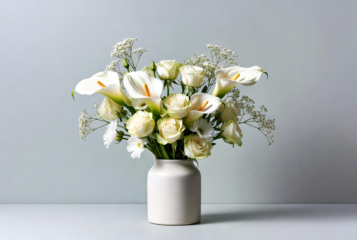arrangement, background, beauty, bouquet, calming, decoration, design, floral, flowers, greenery, home, indoor, lilies, nature, roses, simple, still life, table, vase, white