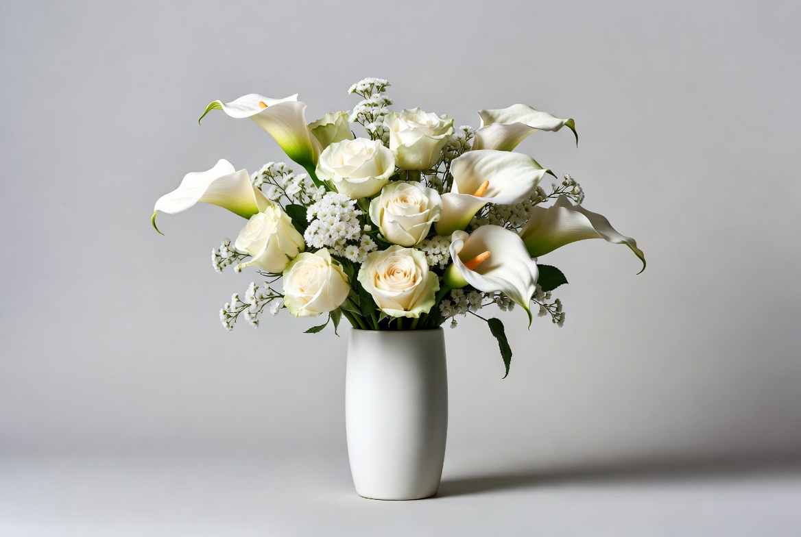 A bouquet of white roses and calla lilies arranged in a plain vase sits on a neutral background, emphasizing its beauty and simplicity.