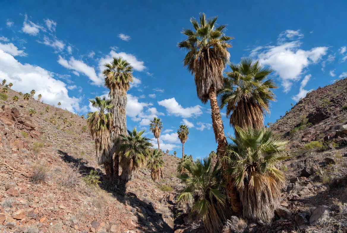 blue sky, desert, dry climate, dry land, environmental, flora, hiking, landscape, nature, outdoors, palm trees, plants, rocky ground, rural, scenic, shadows, sunlight, terrain, vegetation, wilderness
