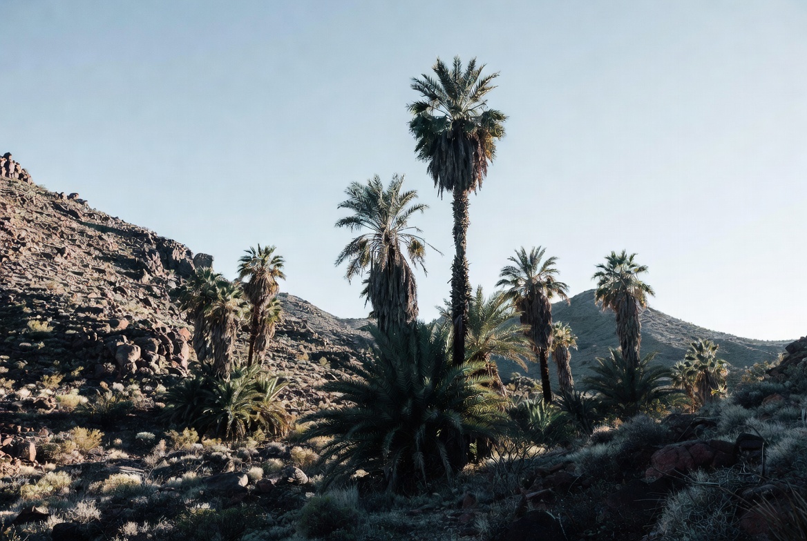 Palm trees grow in a rocky desert area under a clear sky during the day. The scene shows a natural, rugged environment with hills.