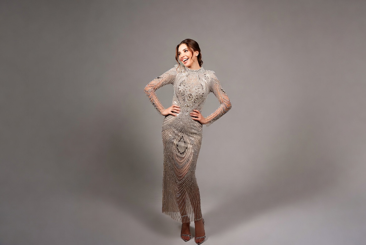 A model stands confidently wearing a long, detailed dress. She smiles and poses with hands on her hips in a studio setting.