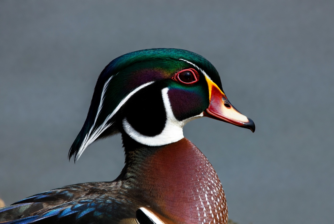 animal, aquatic, beak, bird, close view, colorful, eye, fauna, feathers, habitat, lake, male duck, nature, outdoor, pond, portrait, standing, water, wildlife, wood duck