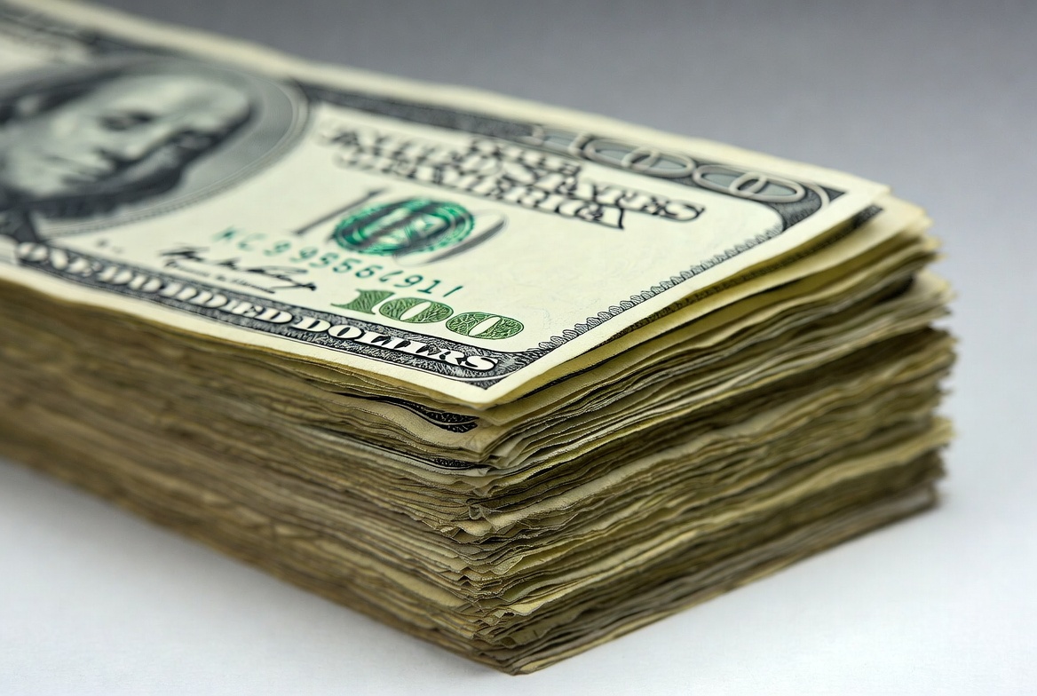 A large stack of one hundred dollar bills is neatly arranged on a plain surface. The money is folded and tightly packed.