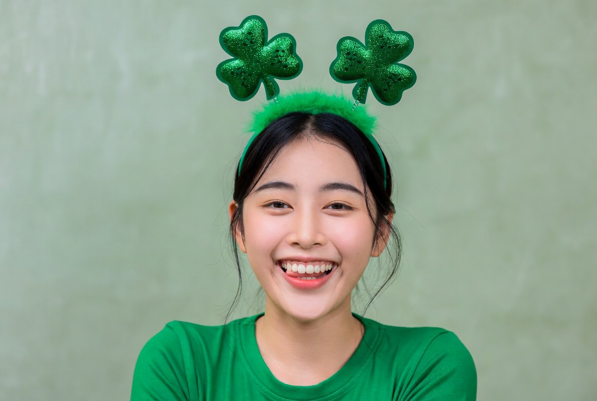 Girl with shamrock headband smiles happily while celebrating. She wears a green shirt and poses in front of a plain background.