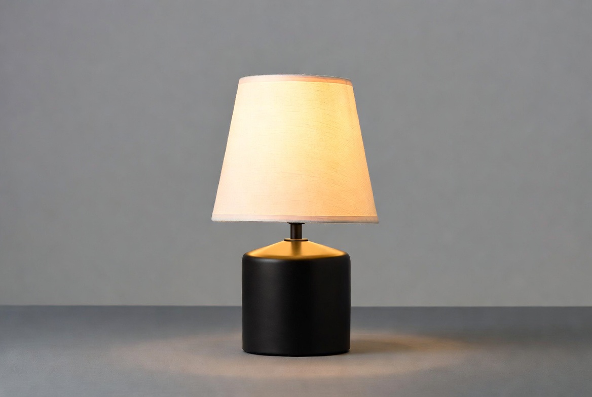 A lamp with a soft shade sits on a plain surface. The light glows gently, creating a warm ambiance in the room.