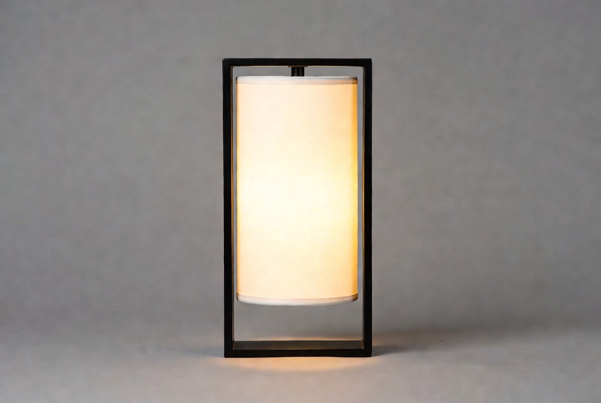 A table lamp stands in a studio with a minimalistic design. The lamp has a soft light and a simple black frame.