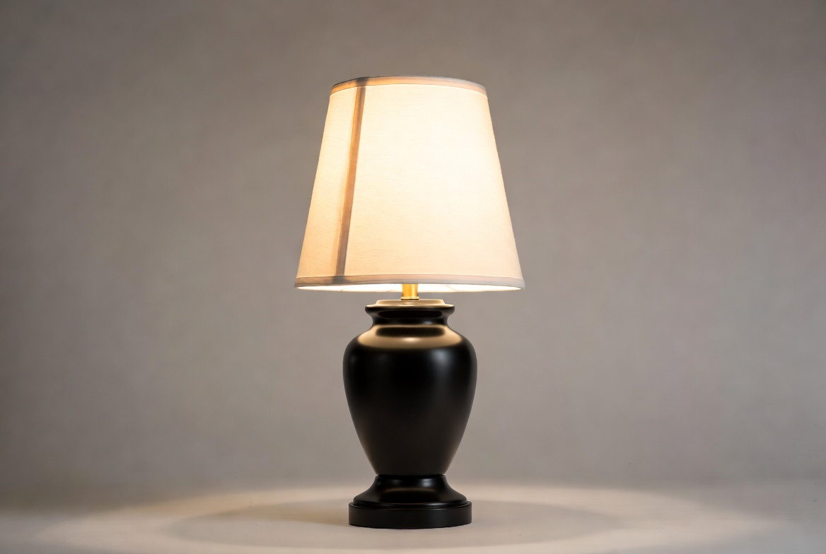 A black lamp stands on a surface with a soft light shade. It casts a warm glow in a simple setting.