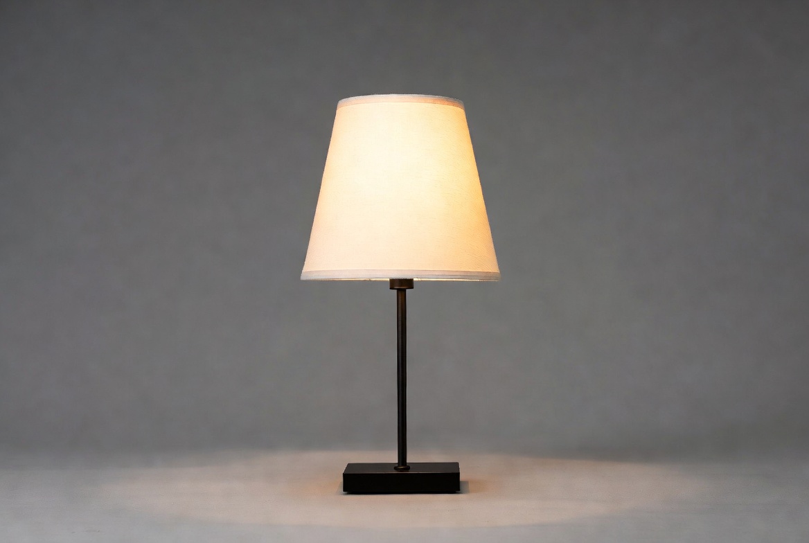 bright, decor, design, furniture, gray background, home, illumination, indoor, interior, lamp, light source, lights, modern, room, shade, simple, solid base, space, table, warm light