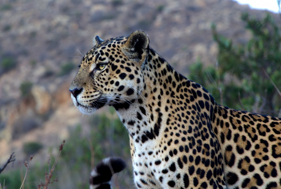 A leopard stands still in a natural setting, looking towards the distance with sharp focus. The background shows hills and greenery.
