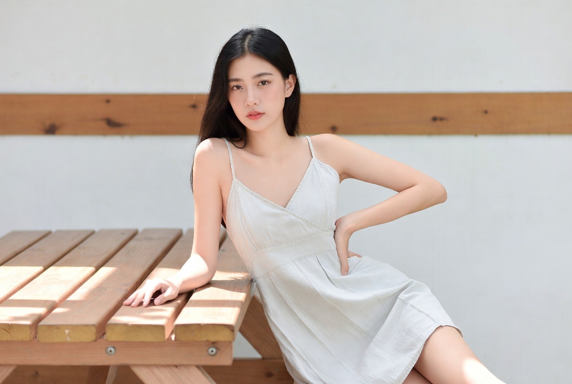 Model posing near wooden table
