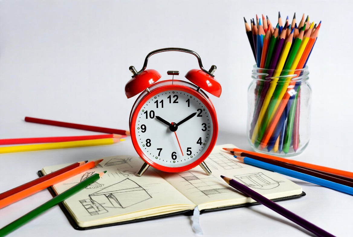 A red clock sits on an open notebook with sketches. Nearby, a jar holds many colored pencils scattered on the desk.