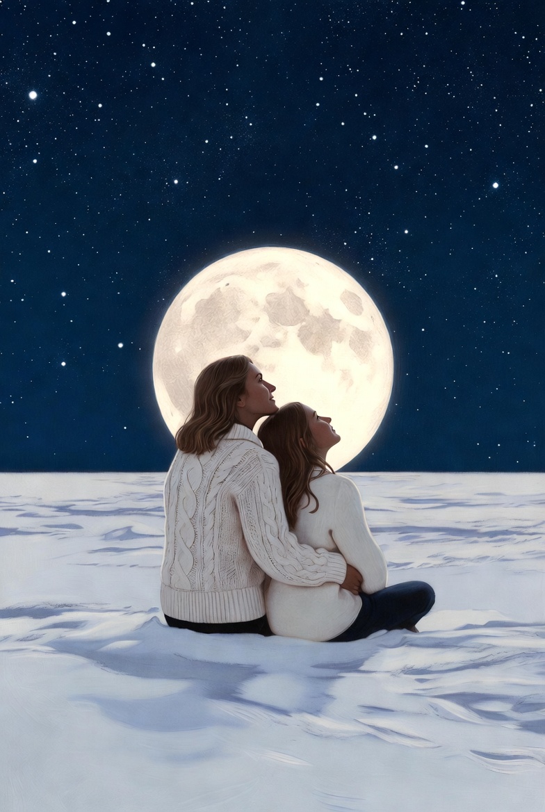 Two people sit together on snow, looking at a large moon in the night sky, enjoying a moment of connection and stillness.