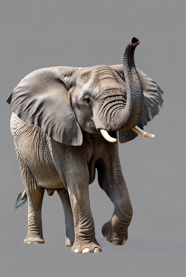 An elephant walks forward with its trunk raised. The animal shows its large ears and tusks. The setting has a plain background.