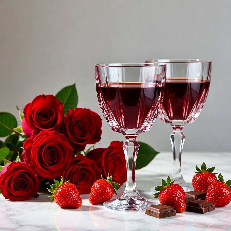 Two glasses with red liquid sit next to fresh strawberries and roses on a white marble table. The scene shows a romantic setup for a special occasion.