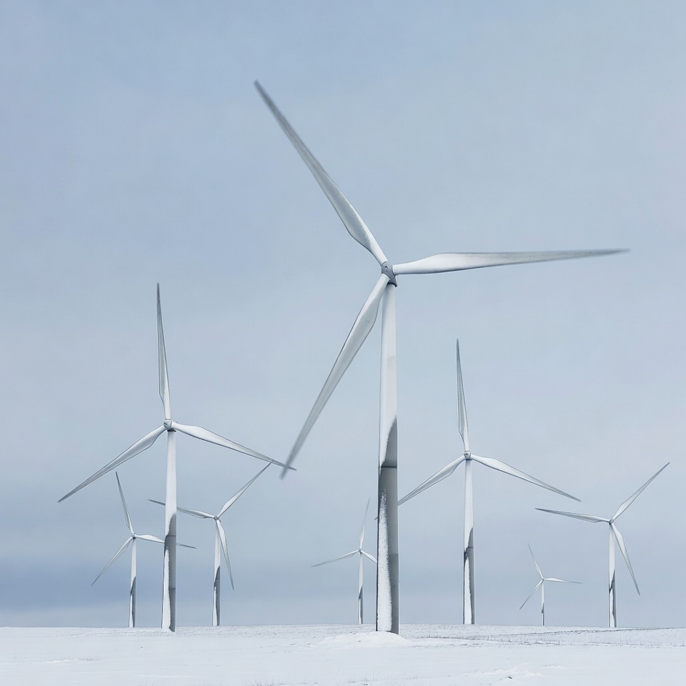 clean energy, climate, cold weather, eco-friendly, electricity, environment, field, gray sky, landscape, landscape features, nature, renewable energy, rural area, snowy landscape, sustainability, technology, turbines, wind farm, wind power, winter