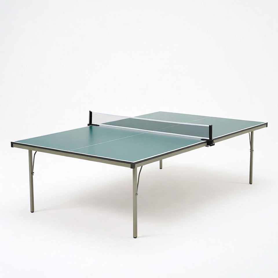 Table for playing ping pong is set up indoors. The green surface is ready for a match with a net dividing the playing area.