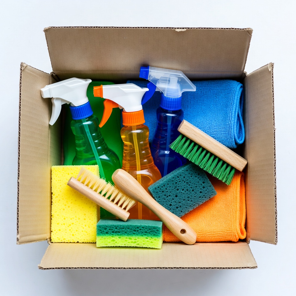 Various cleaning supplies are arranged in a cardboard box. Bottles, sponges, brushes, and cloths are visible for different cleaning tasks.