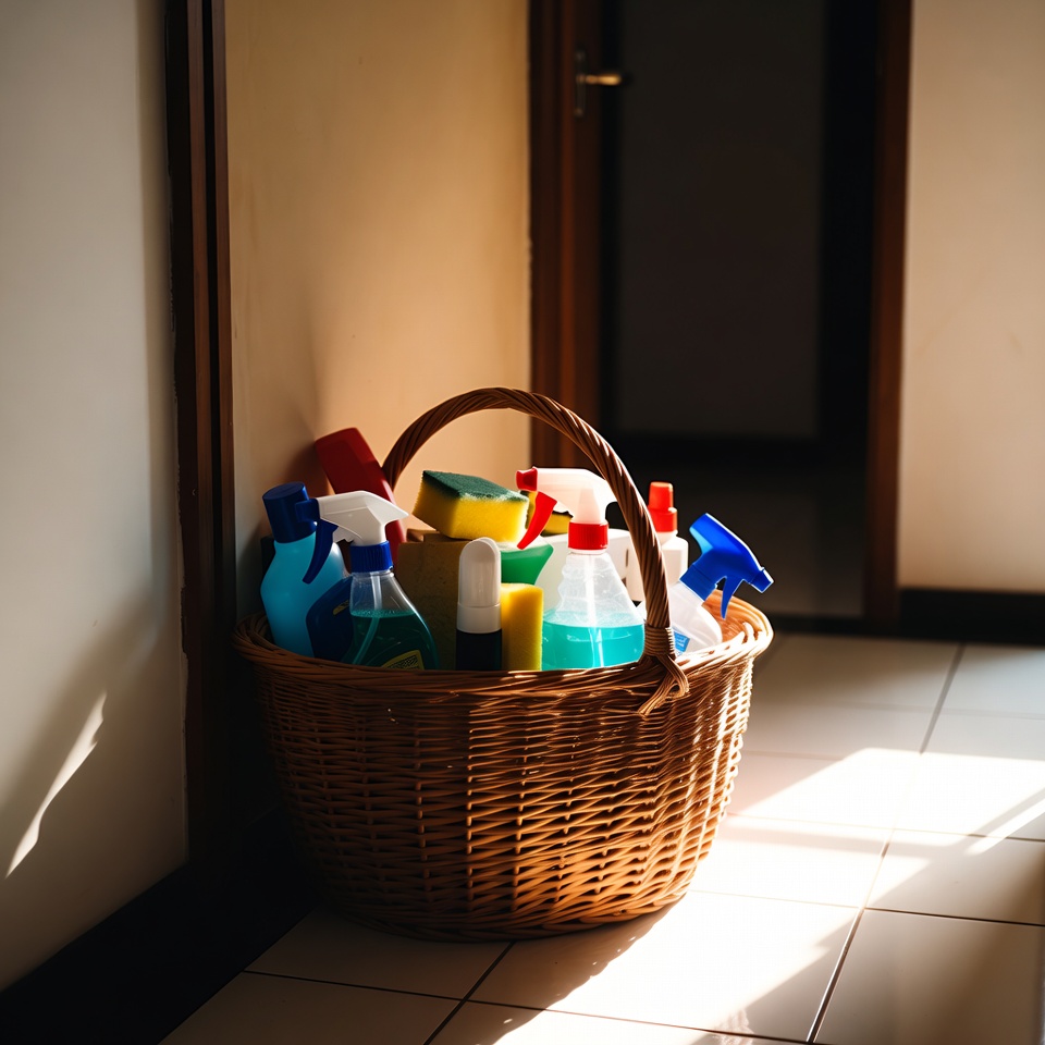 A basket filled with various cleaning supplies is placed near a door inside a room. The sunlight casts shadows around the area.